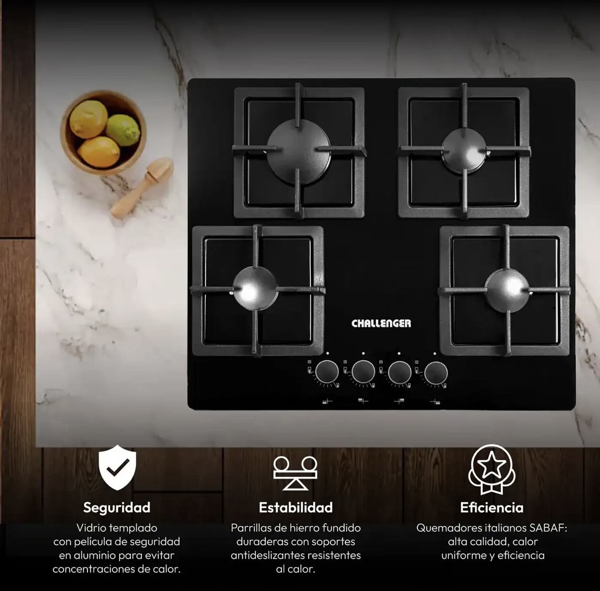 La compré porque en la casa cocinamos bastante. Los quemadores SABF tienen buena potencia y control de la llama. Me gustó mucho el acabado negro, se ve elegante. Hasta ahora todo perfecto.